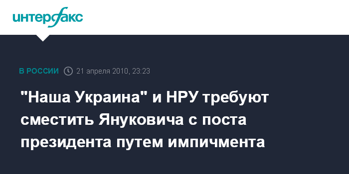 Киев. 21 апреля. ИНТЕРФАКС-УКРАИНА - В партии "Наша Украина" заявляют о необходимости смещения президента Украины Виктора Януковича с поста главы государства посредством импичмента ввиду нарушения им норм Конституции.