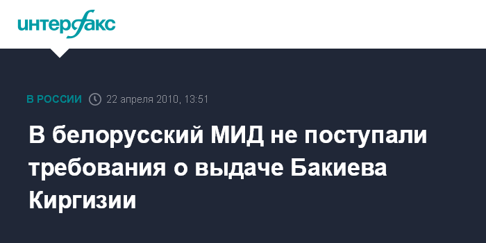 Минск. 22 апреля. INTERFAX.RU - В белорусский МИД на данный момент не поступало каких-либо нот из Киргизии о выдаче находящегося в Минске Курманбека Бакиева, заявил на брифинге в четверг в Минске пресс-секретарь внешнеполитического ведомства Белоруссии Андрей Савиных.