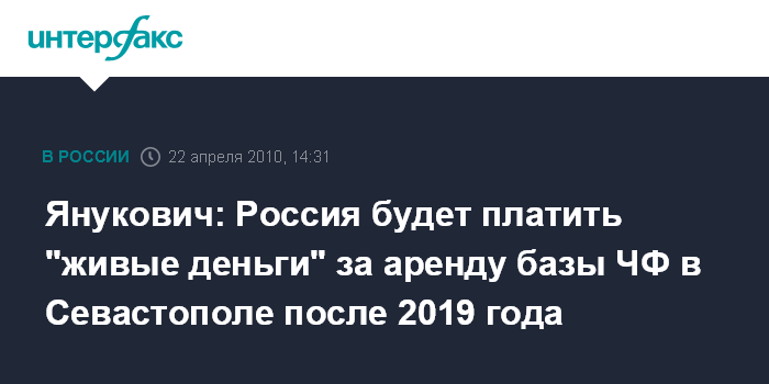 Москва. 22 апреля. INTERFAX.RU - Россия, сделавшая скидку Украине за газ, будет платить за аренду базы Черноморского флота в Севастополе "живые деньги" на уровне $ 98 млн ежегодно после 2019 г., сообщил в четверг президент Украины Виктор Янукович На пресс-конференции в четверг в Киеве, Янукович напомнил, что расчетная цена аренды военной базы в Крыму (по договору 1997 года - ИФ) составляла $ 97,85 млн в год, и эти деньги ежегодно списывались с Украины, как зачет за долги по использованному природному газу, который был поставлен Россией на Украину с первых лет независимости.