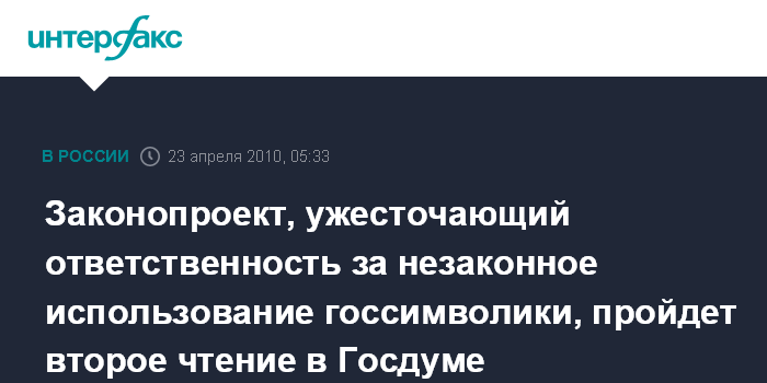 Москва. 23 апреля. ИНТЕРФАКС - Госдума в пятницу рассмотрит во втором чтении правительственный законопроект, усиливающий административную ответственность за незаконное использование государственной символики, а также незаконное ношение форменной одежды и государственных наград.