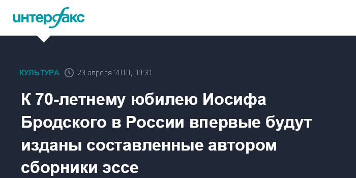 Москва. 23 апреля. INTERFAX.RU - Двадцать четвертого мая 2010 года исполнится 70 лет со дня рождения великого русского поэта второй половины XX века, лауреата Нобелевской премии по литературе, Иосифа Бродского.