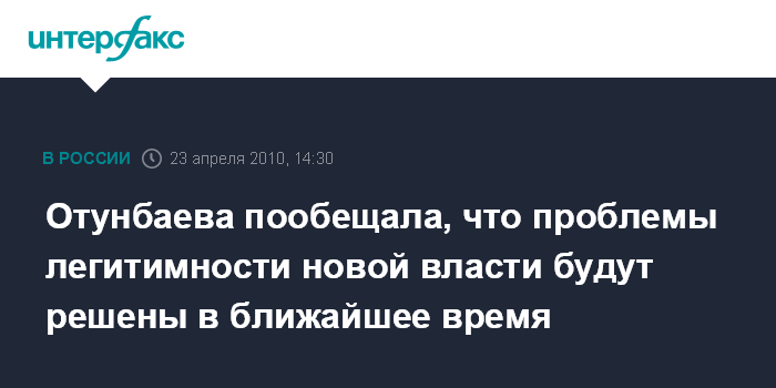 Москва. 23 апреля. INTERFAX.RU - Глава временного киргизского правительства Роза Отунбаева заявила, что проблемы легитимности новой власти будут решены в ближайшее время. "В ближайшее время временное правительство будет решать вопросы легитимности власти", - заявила в пятницу на заседании Международного делового совета глава временного киргизского правительства Роза Отунбаева. "Мы ответственны перед международным сообществом и у нас есть определенные вопросы легитимности новой власти", - отметила она.