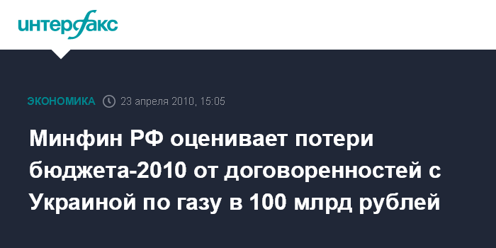 Минфин РФ оценивает потери бюджета-2010 от договоренностей с Украиной по газу в 100 млрд рублей