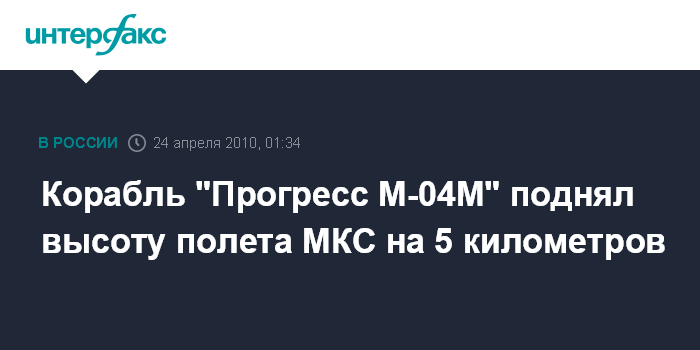 Москва. 24 апреля. ИНТЕРФАКС-АВН - Российский грузовой корабль "Прогресс М-04М" завершил выполнение коррекции высоты орбиты Международной космической станции (МКС), подняв ее на 5 километров, сообщил "Интерфаксу-АВН" в субботу представитель подмосковного Центра управления полетами (ЦУП).