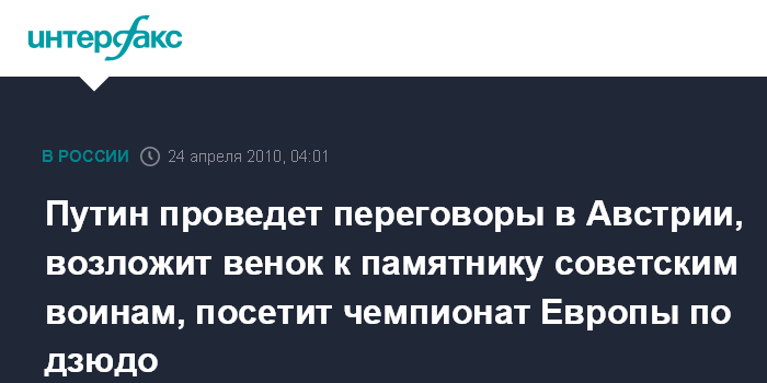 Путин проведет переговоры в Австрии, возложит венок к памятнику советским воинам, посетит чемпионат Европы по дзюдо
