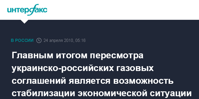 Киев. 24 апреля. ИНТЕРФАКС-УКРАИНА - Пересмотр газовых соглашений с Россией дает возможность для стабилизации экономической ситуации и модернизации украинской экономики, заявил в пятницу премьер-министр Украины Николай Азаров выступая в прямом эфире телеканала "Интер".