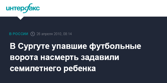 Москва. 26 апреля. INTERFAX.RU - Следственное управление СКП РФ по Ханты-Мансийскому автономному округу - Югре начало проверку по факту гибели 7-летнего мальчика, которого придавили упавшие футбольные ворота, сообщает в понедельник пресс-служба СУ.