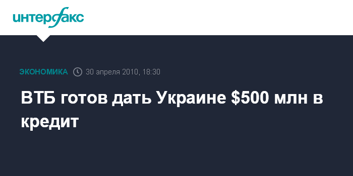 Москва. 30 апреля. INTERFAX.RU - ВТБ готов предоставить Украине в ближайшее время кредит, заявил глава правительства РФ Владимир Путин в пятницу после российско-украинских переговоров в Сочи.