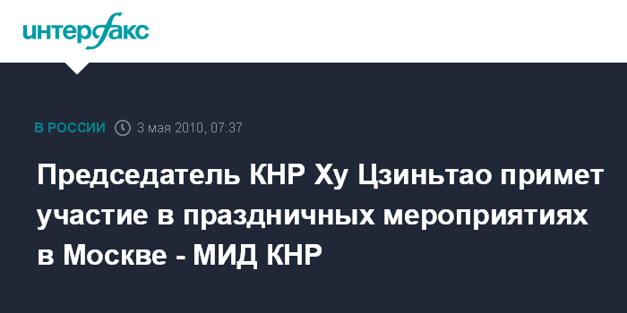 "По приглашению президента РФ Дмитрия Медведева, председатель КНР Ху Цзиньтао с 8 по 9 мая 2010 года примет участие в праздничных мероприятиях в Москве по случаю 65-й годовщины победы в Великой Отечественной войне", - сообщила официальный представитель МИД КНР Цзян Юй.