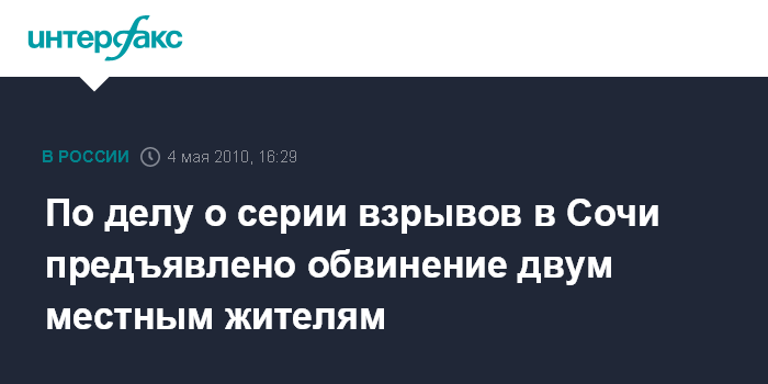 Москва. 4 мая. INTERFAX.RU – Двое жителей Краснодарского края обвиняются в совершении серии взрывов в городе Сочи и других преступлениях, сообщает СКП РФ.