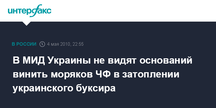 Киев. 4 мая. ИНТЕРФАКС-УКРАИНА - В Министерстве иностранных дел Украины заявляют, что по имеющейся информации на данный момент нет никаких оснований возлагать ответственность на российских моряков за затопление украинского буксира "Бугский".