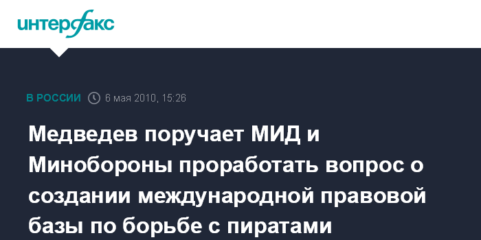 Москва. 6 мая. INTERFAX.RU - Президент РФ Дмитрий Медведев намерен дать поручение МИД РФ и министерству обороны о проработке вопроса, касающегося создания международной правовой базы по борьбе с пиратством. "Я дам поручение министру иностранных дел и Вам, соответственно, по созданию международной базы по борьбе с пиратством", - сказал в четверг Медведев на встрече с главой Минобороны Анатолием Сердюковым. При этом российский лидер отметил, что он неоднократно поднимал этот вопрос на международном уровне, в том числе, на саммите в Вашингтоне.