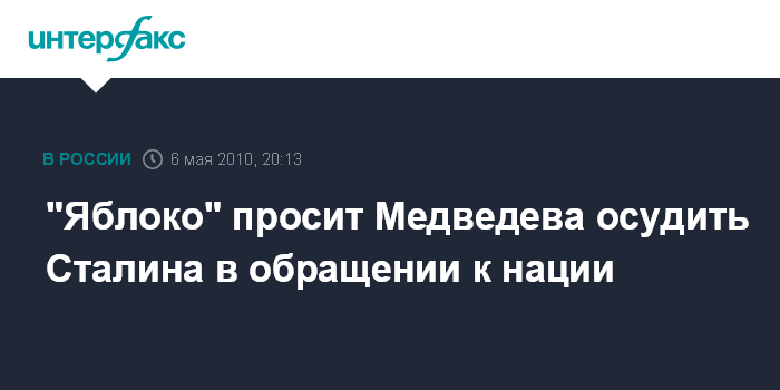 "Мы призываем президента РФ дать, наконец, жесткую официальную оценку сталинской системе и ее "примазыванию" к Великой Победе - не в интернетовском блоге, не в интервью, а в обращении к нации", - говорится в заявлении председателя партии "Яблоко" Сергея Митрохина, распространенном в четверг.