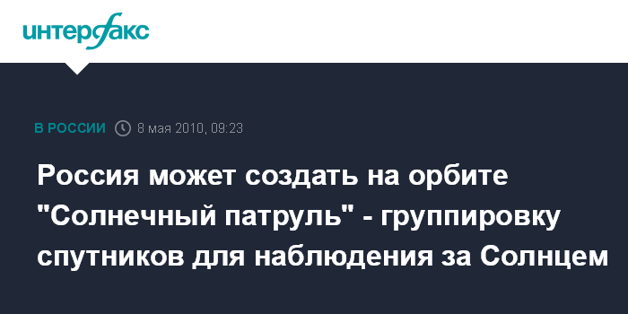 "Разговоры о проекте "Солнечный патруль", в рамках которого с космических аппаратов должен вестись постоянный мониторинг Солнца, ведутся уже давно. Если РАН примет решение, что этот проект имеет перспективы и необходим, мы приступим к его реализации", - сказал собеседник агентства.