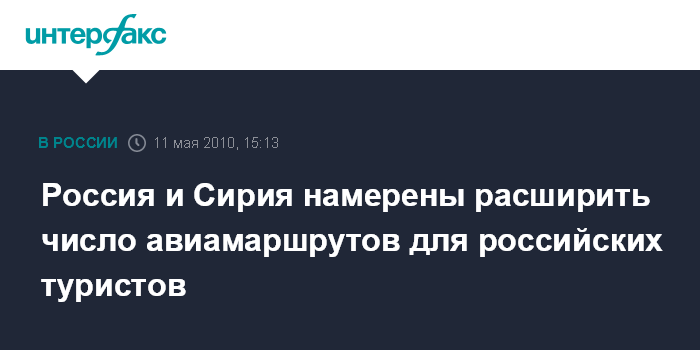 Дамаск. 11 мая. INTERFAX.RU - Москва и Дамаск договорились рассмотреть возможность расширить географию полетов для российских туристов, заявил министр транспорта Игорь Левитин журналистам по итогам переговоров на высшем уровне в Дамаске во вторник.