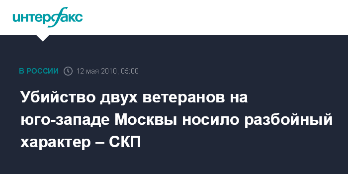 Москва. 12 мая. ИНТЕРФАКС - Руководитель Следственного управления СКП РФ по Москве Анатолий Багмет считает, что двух женщин ветеранов Великой Отечественной войны могли убить в разбойных целях.