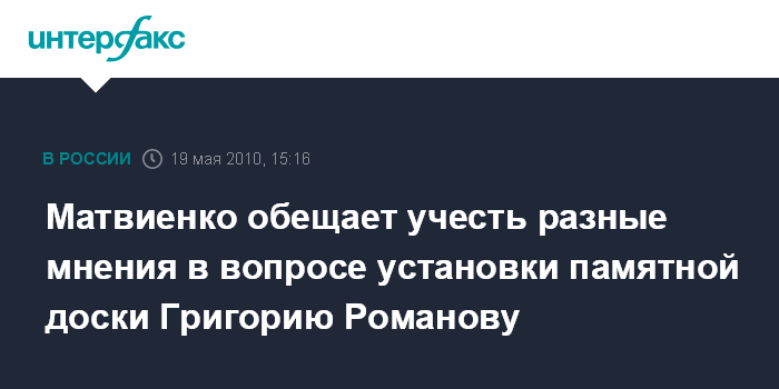 Москва. 19 мая. INTERFAX.RU - Губернатор Петербурга Валентина Матвиенко считает нормальной возникшую дискуссию о целесообразности установки мемориальной доски первому секретарю Ленинградского обкома КПСС Григорию Романову. "Давайте спокойно, как интеллигентный город, общество обсуждать и взвешивать, чтобы не было антагонизма и озлобленности", - сказала Матвиенко на пресс-конференции в Смольном в среду, отвечая на вопрос о протестах общественности по поводу планов установки доски. Она подчеркнула, что к Романову существует разное отношение, как к любой уходящей в историю фигуре, и отметила необходимость учесть мнение всех ревностно относящихся к такой почести, как установка памятной доски.