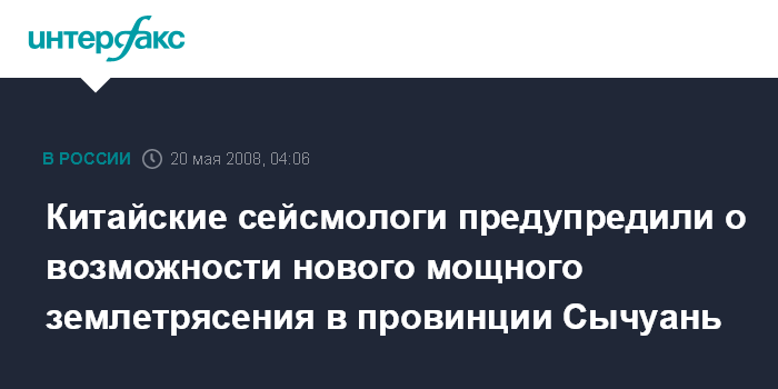 Пекин. 20 мая. ИНТЕРФАКС-КИТАЙ - Китайское сейсмологическое управление поздно вечером в понедельник сообщило, что в провинции Сычуань, где 12 мая произошло разрушительное землетрясение силой 7,8 бала по шкале Рихтера, во вторник возможны новые мощные подземные толчки силой до 8 баллов.
