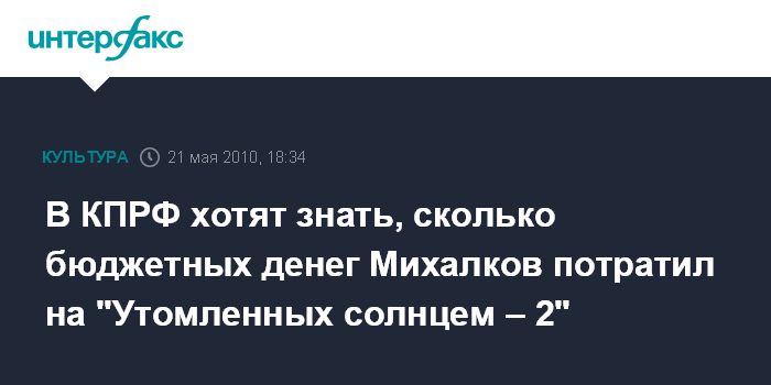 Москва. 21 мая. INTERFAX.RU - Депутат-коммунист Николай Рябов намерен добиваться от министерства культуры официального ответа на свой запрос о том, сколько было выделено бюджетных средств кинорежиссеру Никите Михалкову на создание фильма "Утомленные солнцем - 2".