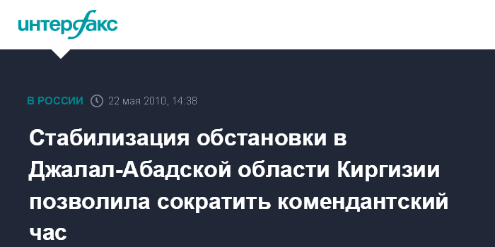 Москва. 22 мая. INTERFAX.RU - Комендантский час в Джалал-Абадской области Киргизии с субботы сокращен на два часа, сообщили "Интерфаксу" в Управлении информации МВД республики.