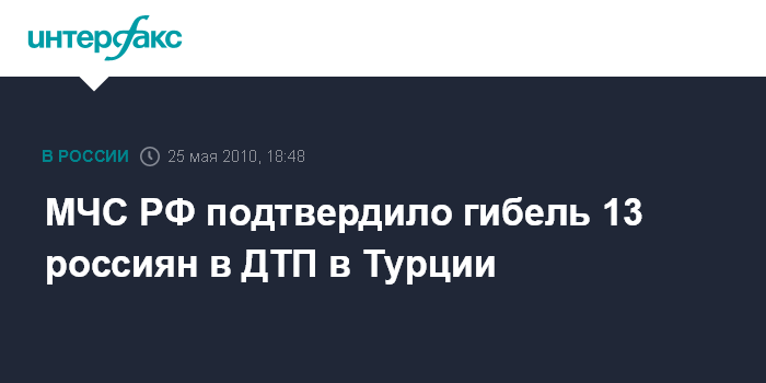 Москва. 25 мая. INTERFAX.RU - МЧС РФ подтвердило гибель 13 россиян и ранения 26-ти россиян в ДТП с участием туристического автобуса в Турции.