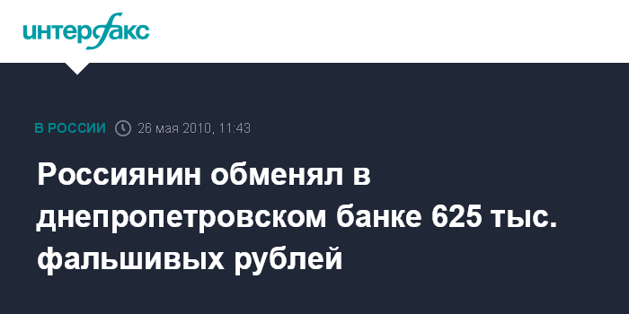 Москва. 26 мая. INTERFAX.RU – Украинские правоохранительные органы задержали в Кировоградской области гражданина России, который за один день обменял в отделении коммерческого банка Днепропетровска 625 тыс. фальшивых российских рублей (более 160,5 тыс. грн).