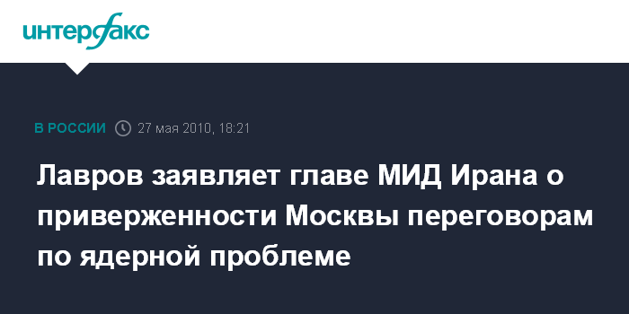 Москва. 27 мая. INTERFAX.RU – Россия готова активно содействовать переговорам по урегулированию ситуации вокруг Ирана и уверена в необходимости политико-дипломатического решения данной проблемы, заявил глава МИД РФ Сергей Лавров.