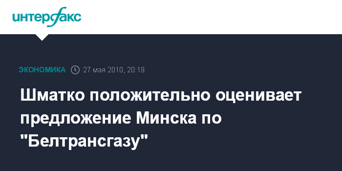 Москва. 27 мая. INTERFAX.RU – Министр энергетики РФ Сергей Шматко считает позитивным сигналом готовность Белоруссии отдать контрольный пакет "Белтрансгаза" в обмен на российские цены на газ, в то же время отмечая, что 51% акций "не решат проблемы".