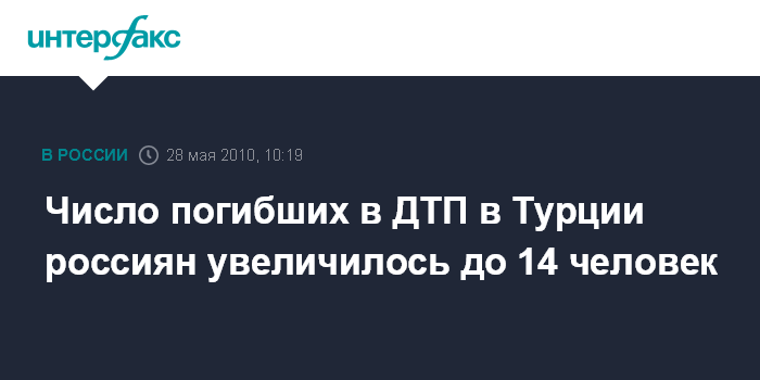 Москва. 28 мая. INTERFAX.RU - Российское консульство в Анталье подтверждает гибель в турецкой больнице еще одной российской туристки, пострадавшей в результате ДТП в минувший вторник. Как заявил "Интерфаксу" в пятницу по телефону российский консул в Анталье Мирджалол Хусанов, минувшей ночью скончалась еще одна пострадавшая. Таким образом, количество погибших увеличилось до 16 человек, среди которых - двое граждан Турции.