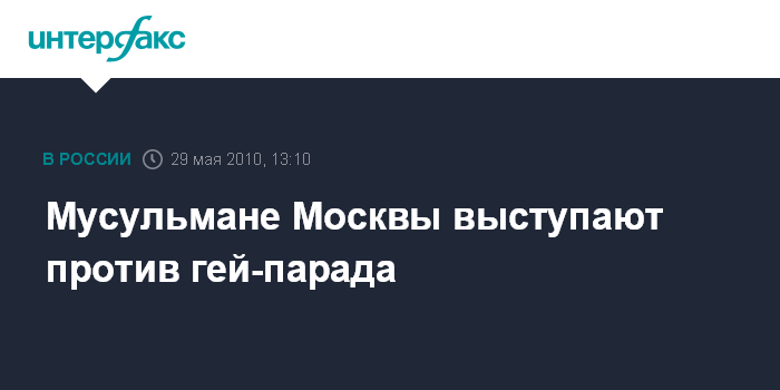 Москва. 29 мая. INTERFAX.RU - Мусульманская умма Москвы полностью поддерживает принципиальную позицию мэра города Юрия Лужкова и городских властей по недопущению публичных акций сексуальных меньшинств.