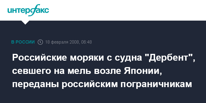 Южно-Сахалинск. 18 февраля. INTERFAX.RU - Десятерых российских моряков с судна "Дербент" под флагом Камбоджи, которое 1 января 2008 года село на мель с северо-восточной стороны острова Рисири (Япония), в понедельник в 12:00 по местному времени японская сторона передала сахалинским морским пограничникам.
