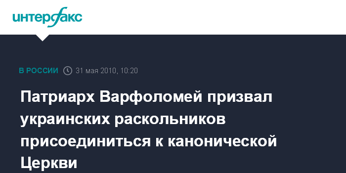 Стрельна. 31 мая. INTERFAX.RU - Патриарх Константинопольский Варфоломей призвал раскольников на Украине раскаяться и присоединиться к канонической Православной церкви.