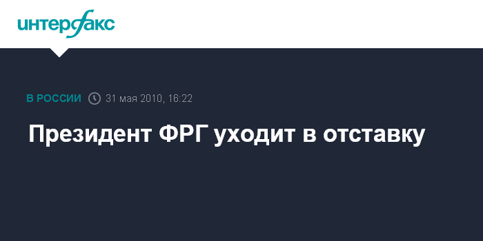 Москва. 31 мая. INTERFAX.RU - Президент Германии Хорст Келер подает в отставку, сообщает в понедельник британская телерадиокорпорация BBC. О причинах такого решения главы германского государства пока не сообщается.