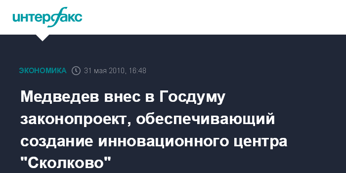 Москва. 31 мая. INTERFAX.RU - Президент РФ Дмитрий Медведев внес в Госдуму проект федерального закона "Об инновационном центре "Сколково", сообщила в понедельник пресс-служба Кремля. Законопроект направлен на обеспечение условий для создания и функционирования инновационного центра.