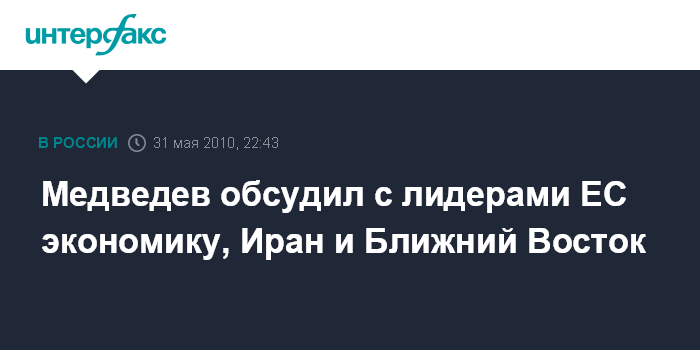 Ростов-на-Дону. 31 мая. ИНТЕРФАКС – Президент России Дмитрий Медведев и руководители Евросоюза обсудили вопросы экономического развития Европы, России, а также ключевые вопросы международной политики, в том числе иранскую ядерную программу, сообщила журналистам пресс-секретарь главы российского государства Наталья Тимакова.
