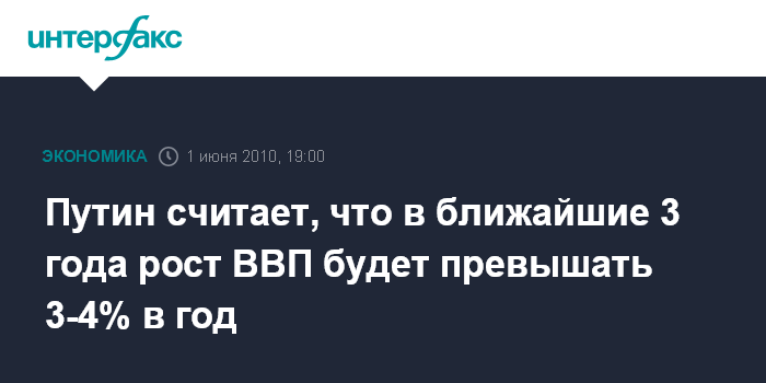 Москва. 1 июня. INTERFAX.RU - На встрече с руководством партии "Единая Россия" премьер Владимир Путин заявил, что рост ВВП в ближайшие 3 года будет превышать, по консервативным оценкам, 3-4% в год. По его словам, подъем экономики может оказаться более высоким, чем запланировано, при условии, если удастся реализовать намеченные планы.