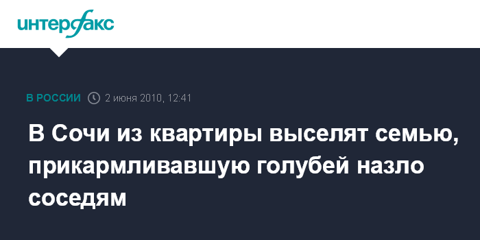 Москва. 2 июня. INTERFAX.RU - Суд Центрального района Сочи вынес решение о выселении из квартиры семьи, которая более 10 лет досаждала соседям, прикармливая городских голубей. В решении суда Центрального района Сочи, текстом которого располагает агентство "Интерфакс-Юг", говорится, что ответчики в течение 12 лет прикармливали стаи городских голубей, запуская их на балкон и кухню. "Карнизы балконов и окон квартир второго и первого этажей, находящихся непосредственно под балконом квартиры N29 (ответчиков - ИФ), испачканы птичьим пометом и налипшим голубиным пухом", - говорится в решении суда.