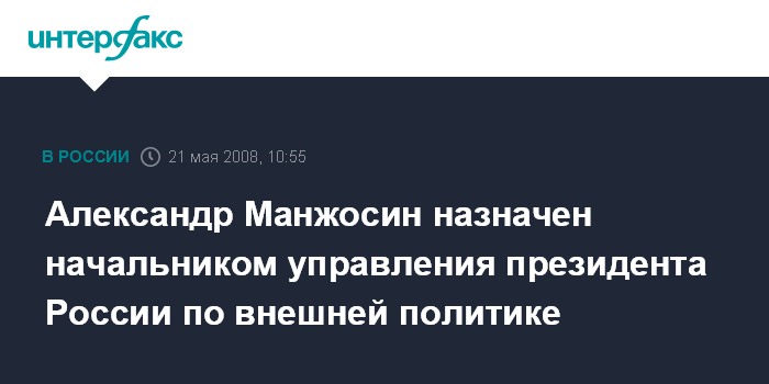 Москва. 21 мая. INTERFAX.RU - Президент России Дмитрий Медведев своим указом назначил Александра Манжосина начальником управления главы государства по внешней политике, сообщила пресс-служба Кремля. Должность начальника управления президента по внешней политике он занимал с апреля 2004 года.