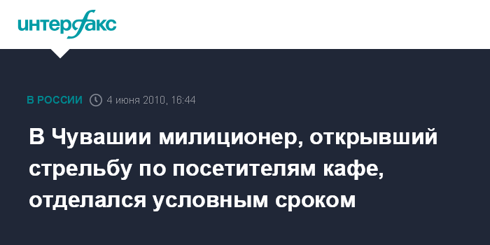 Чебоксары. 4 июня. INTERFAX.RU - Калининский районный суд Чебоксар (Чувашия) приговорил к 2,5 годам лишения свободы условно бывшего сотрудника милиции, устроившего стрельбу по посетителям кафе.