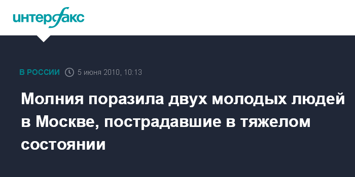 Москва. 5 июня. INTERFAX.RU - Юноша и девушка серьезно пострадали в Измайловском парке, на востоке Москвы, от удара молнии в пятницу вечером, сообщил "Интерфаксу" источник в медицинских кругах столицы в субботу. "Юноша и девушка, 20 и 21 года, прятались от дождя под деревом, неожиданно они были поражены разрядом молнии", - рассказал собеседник агентства. Он уточнил, что оба чудом остались живы и около 22:00 были госпитализированы в ожоговое отделение одной из городских больниц. "Пострадавшие находятся в тяжелом состоянии, врачи борются за их жизнь", - сказал источник.