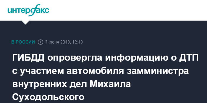 Москва. 7 июня. INTERFAX.RU - Подмосковное управление ГИБДД опровергает информацию ряда СМИ о ДТП в Подмосковье с участием автомобиля охраны первого заместителя министра внутренних дел Михаила Суходольского.