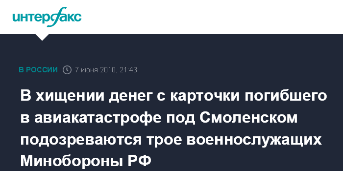 В хищении денег с карточки погибшего в авиакатастрофе под Смоленском подозреваются трое военнослужащих Минобороны РФ