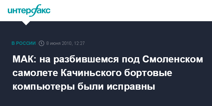 Москва. 8 июня. INTERFAX.RU – Система предупреждения столкновения с землей и бортовые компьютеры на разбившемся под Смоленском самолете президента Польши Леха Качиньского были исправны, сообщили "Интерфаксу" во вторник в Межгосударственном авиационном комитете (МАК).