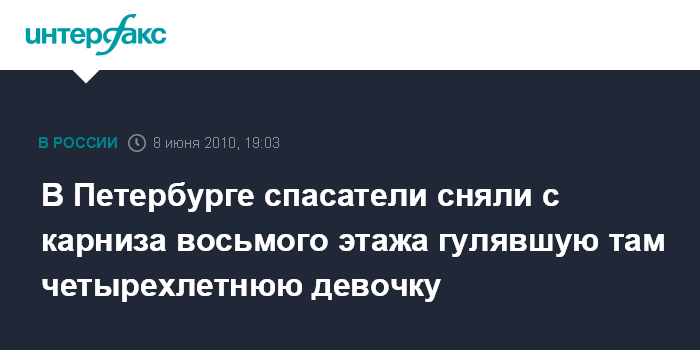 Санкт-Петербург. 8 июня. INTERFAX.RU - Сотрудники Главного управления МЧС по Петербургу сняли с карниза восьмого этажа жилого дома четырехлетнюю девочку, прогуливавшуюся там без присмотра взрослых.