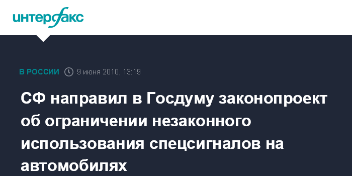 Москва. 9 июня. INTERFAX.RU - Совет Федерации внес в среду в Госдуму законопроект о введении полного запрета на незаконную установку мигалок и звуковых сигналов на автомобилях. Один из авторов законопроекта, глава комитета по промышленной политике Совета Федерации Валентин Завадников в ходе заседания сообщил, что документом вводится прямой запрет на эксплуатацию транспортных средств с незаконно установленными устройствами для подачи специальных световых и звуковых сигналов, либо с незаконно нанесенными на их наружную поверхность цветографическими схемами.