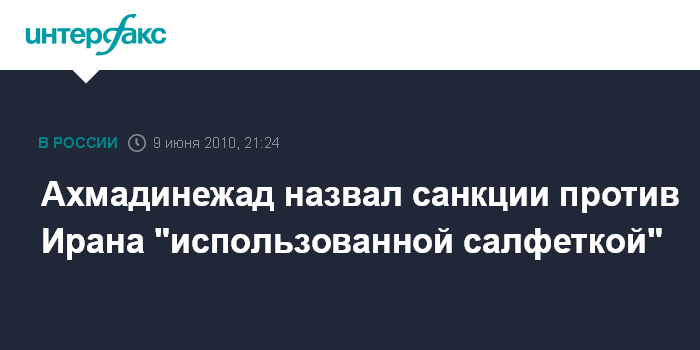 Душанбе. 9 июня. INTERFAX.RU - Президент Ирана Махмуд Ахмадинежад жестко отреагировал на принятую в среду резолюцию Совета безопасности ООН в отношении Тегерана.