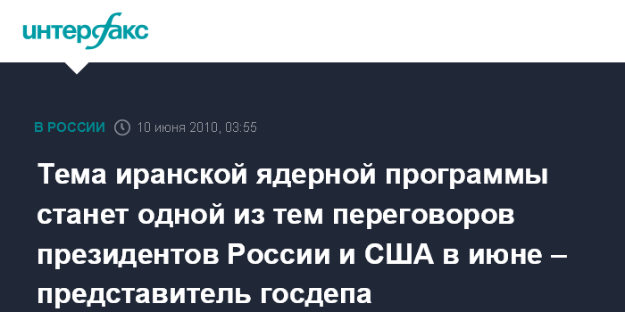 Тема иранской ядерной программы станет одной из тем переговоров президентов России и США в июне – представитель госдепа