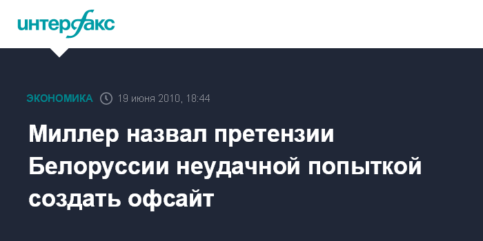 Москва. 19 июня. INTERFAX.RU – Глава "Газпрома" Алексей Миллер назвал заявление Белоруссии том, что "Газпром" должен "Белтрансгазу" $200 млн за транзит российского газа, "неудачной попыткой создать офсайт".