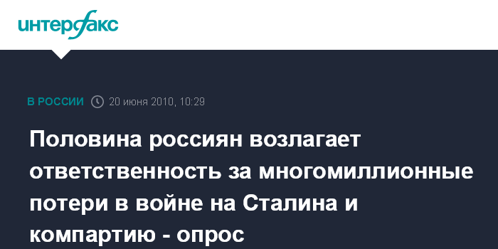 Отвечая на вопрос, "на ком, по Вашему мнению, лежит основная ответственность за наши многомиллионные потери в этой войне", 30% вспомнили Сталина. 28% россиян считают, что ответственность лежит только на немецкой стороне, 20% - "на коммунистической партии и руководстве СССР", 11% - "на всех вместе".