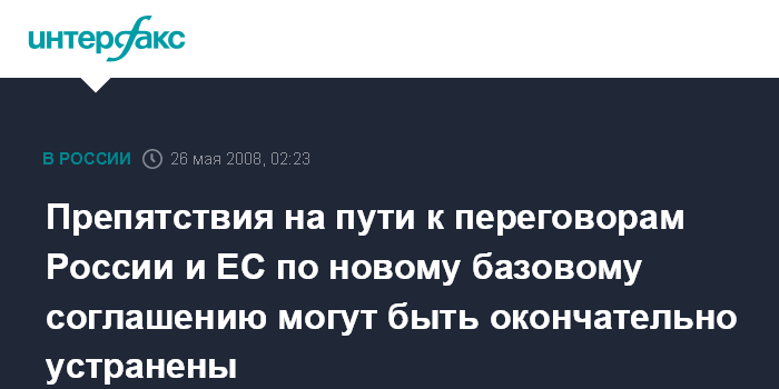 В минувшую среду постоянные представители всех 27 стран ЕС достигли согласия о мандате на переговоры ЕС-Россия по новому базовому соглашению о стратегическом партнерстве, сняв последнее препятствие на пути к этой цели - вето Литвы. Решение этого комитета будет в повестке дня Совета министров иностранных дел ЕС, который должен его утвердить. В случае положительного решения старт переговорам будет дан на саммите ЕС- Россия в Ханты-Мансийске в конце июня.